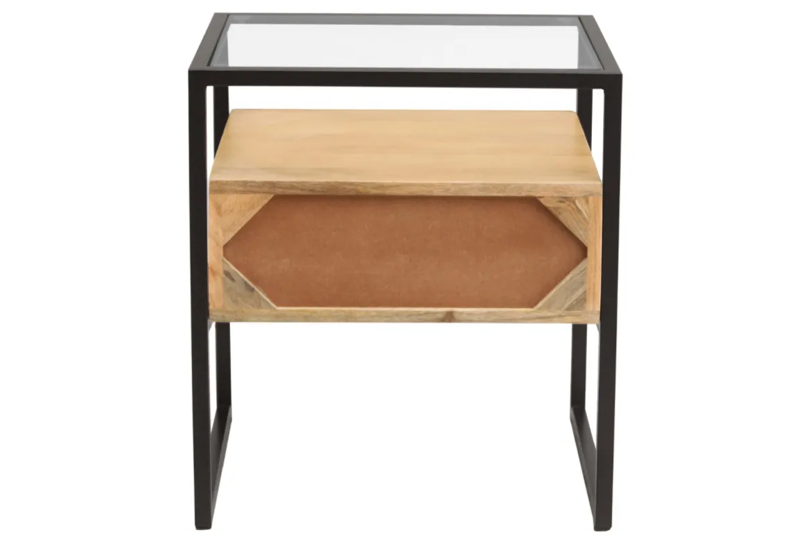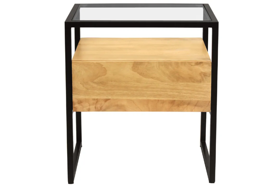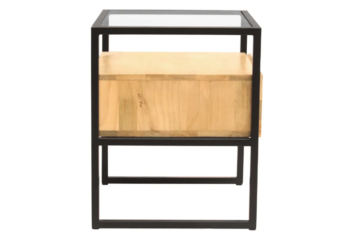 Manguier massif, métal noir, verre transparent : cette table de chevet rectangulaire joue avec les textures avec brio. Moderne tout en étant naturelle, c’est avec élégance que ces matières se dévoilent à l’état pur. Aucun doute, c’est la table de chevet design au look chaleureux et tendance qui mettra véritablement en valeur votre cocon !