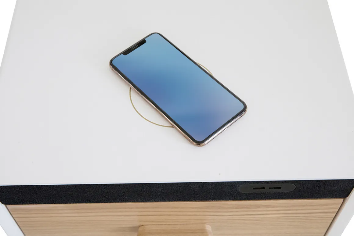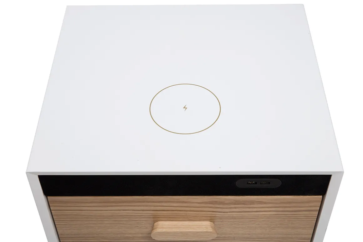 Le chevet PAVAN est doté d’un système de chargement sans fil. Ainsi, vous pourrez recharger simplement votre smartphone en le posant sur le plateau. Finis les câbles emmêlés qui envahissent l’espace ! Ce chevet intègre également deux ports USB qui vous permettront de charger des appareils supplémentaires.