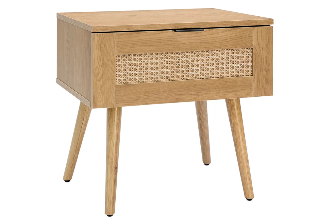 Embrasser le passé avec un piètement légèrement incliné, une structure en bois clair habillée de croisillons en rotin, mais également le futur avec des lignes minimalistes et poignée de tiroir métallique, cette table de nuit en bois revisite un classique avec style !
