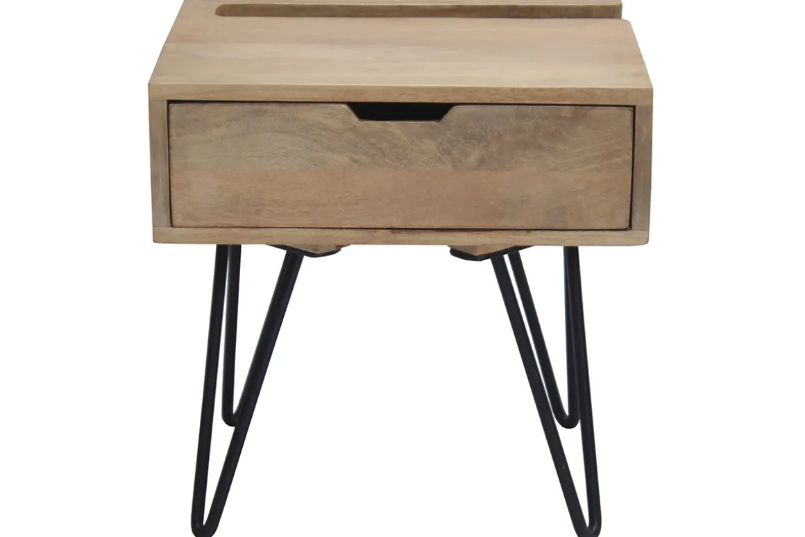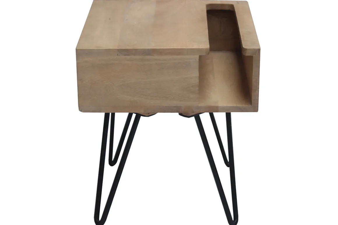 Ses dimensions (L45 x P40 cm) en font un meuble idéal pour organiser une petite chambre. Si ce chevet est un meuble fonctionnel, il ne manque pas non plus de charme. Il est conçu en manguier et en métal noir de façon artisanale. Cette essence de bois possède différents détails et nuances qui offrent un rendu authentique unique. Le piètement métallique en épingle apporte, quant à lui, solidité, stabilité et légèreté à cette table de chevet en bois massif.
