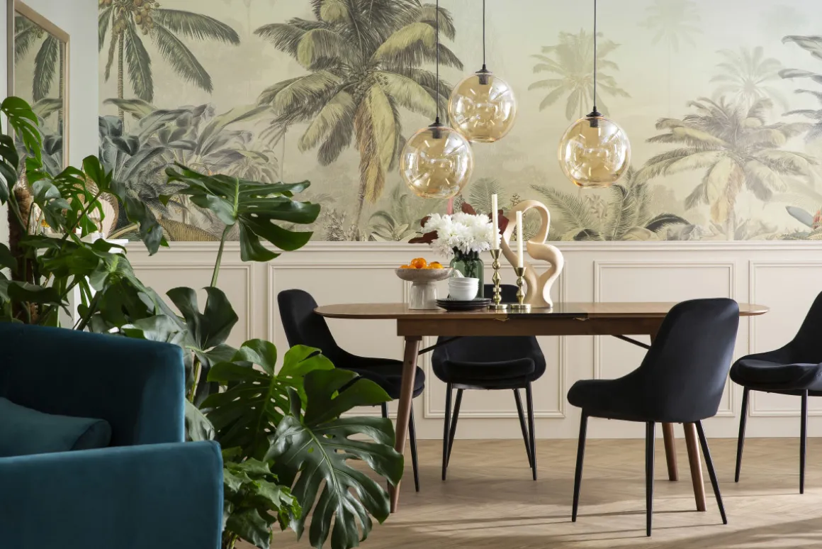 Accompagnée des chaises de la même collection, cette table à manger en bois foncé noyer est idéale pour créer une salle à manger chic, chaleureuse et un brin vintage.