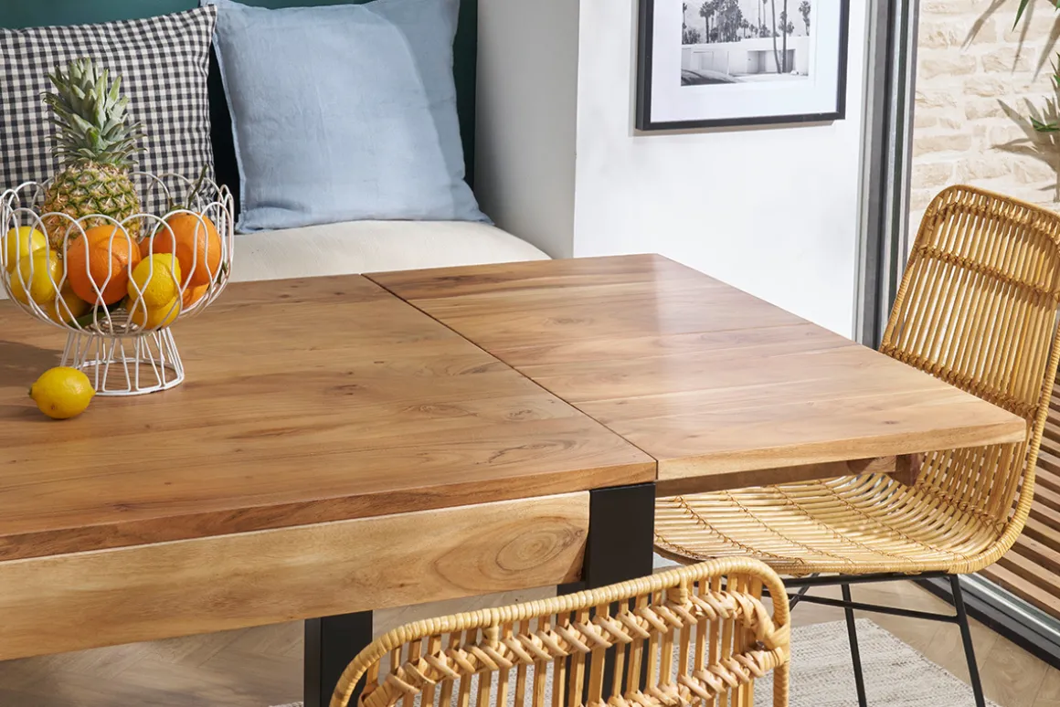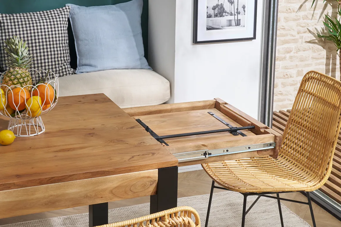 Robuste et stable, cette table extensible rectangulaire à rallonges intégrées en bois et métal 4 à 8 personnes est une belle pièce de mobilier créée pour accompagner de nombreux repas intimistes et moments conviviaux. On la complète avec des chaises design dépareillées pour une salle à manger aussi confortable que tendance !