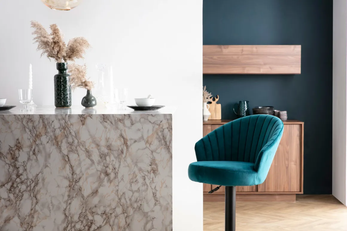 Pensé en forme de coquillage, ce tabouret de bar en tissu velours gaufré bleu canard offre un parfait confort d’assise avec son dossier avec surpiqûres qui englobe la forme du dos et son siège pivotant. Le style original et raffiné fait de ce tabouret de bar design une pièce de mobilier incontournable de votre déco. IZAAC deviendra un élément central de votre cuisine ou de votre pièce de vie ! Autour d’une table de bar ou d’un comptoir, ce tabouret de bar réglable bleu canard s’adapte en hauteur d’assise (H64 à 87 cm) : parfait pour s’adapter à une table haute, un bar ou îlot ! Muni de son repose-pied, il accompagnera avec confort et convivialité vos apéritifs et autres petits déjeuners.