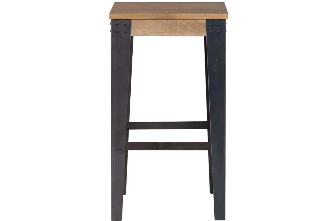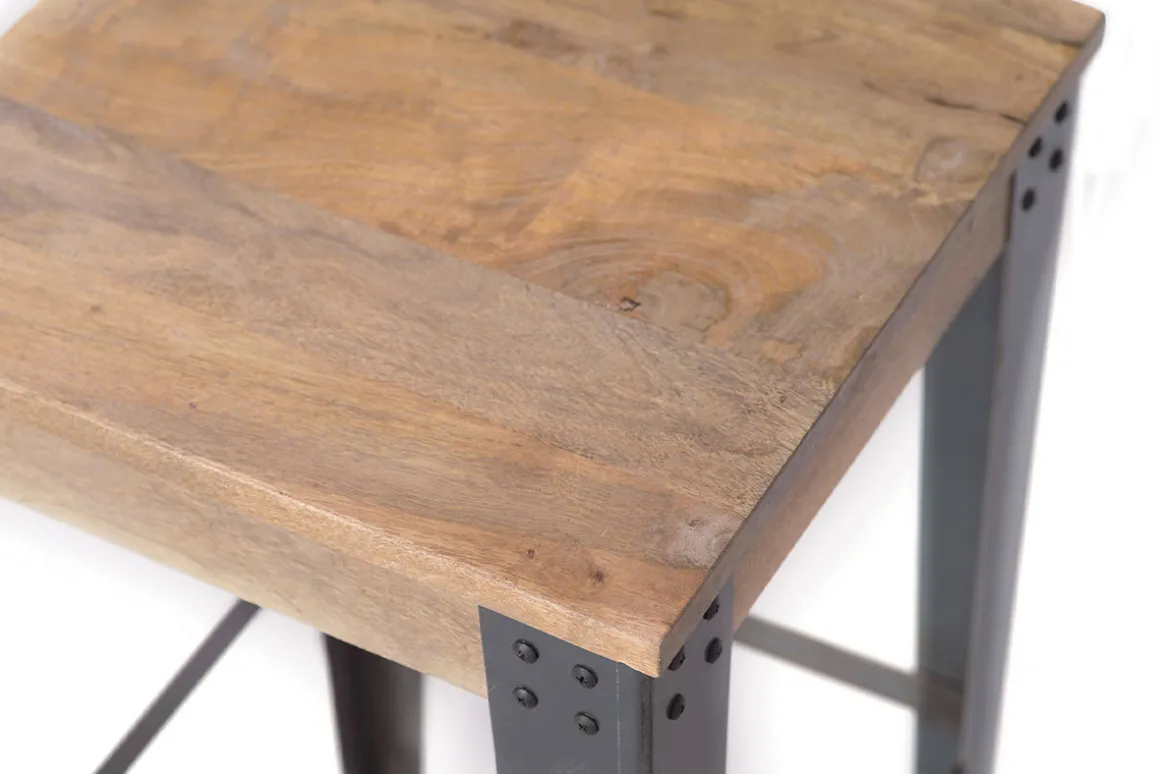 Les angles renforcés par des cornières rivetées soutiennent ce tabouret en manguier. Le manguier est nuancé de tons jaunes à marron pour un intérieur chaleureux et tendance. C’est également un bois très résistant qui saura durer dans le temps sans vieillir. Il est apprécié pour son aspect strié et se marie joliment avec les matériaux bruts tels que le métal.