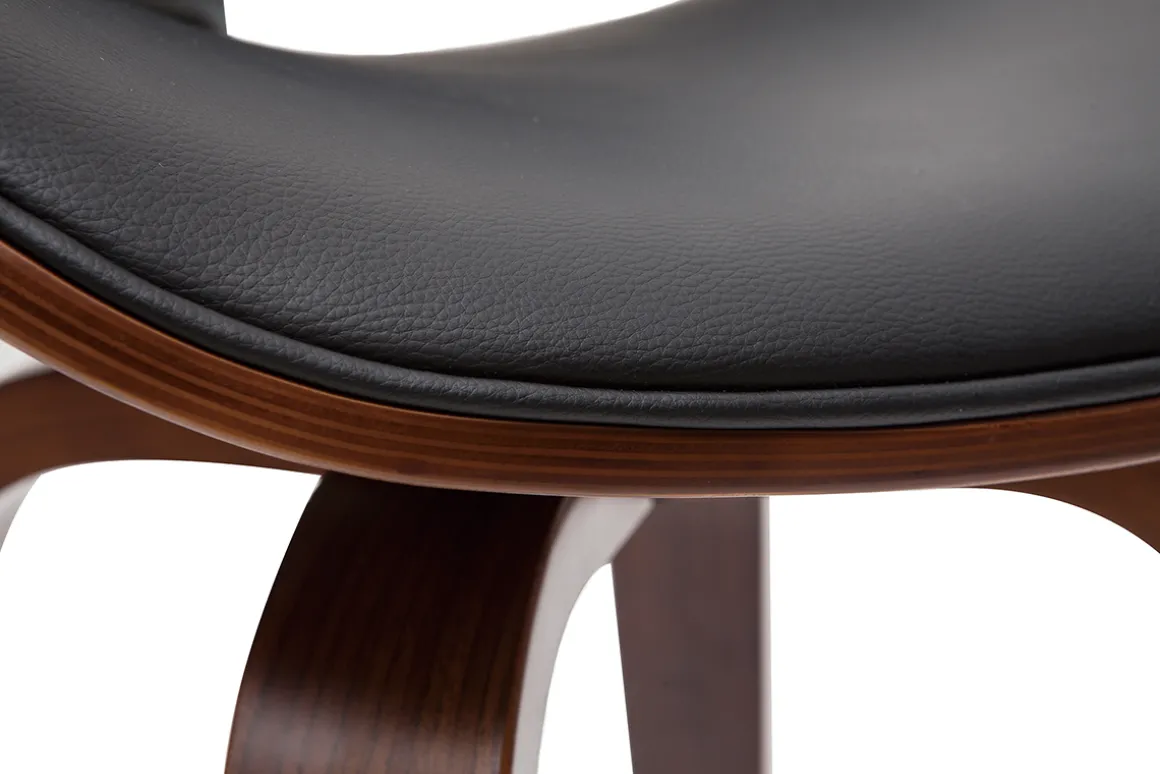 Avec son design travaillé tout en rondeur, cette chaise haute apportera douceur et modernité à votre espace repas. Sa structure en bois foncé chaleureuse associée à son assise en polyuréthane noir fait de ce tabouret de bar un élément tendance. Inspiré du mobilier vintage, il est aussi irrésistiblement contemporain grâce à ses courbes et son piètement muni d’un repose-pied rond en acier chromé.