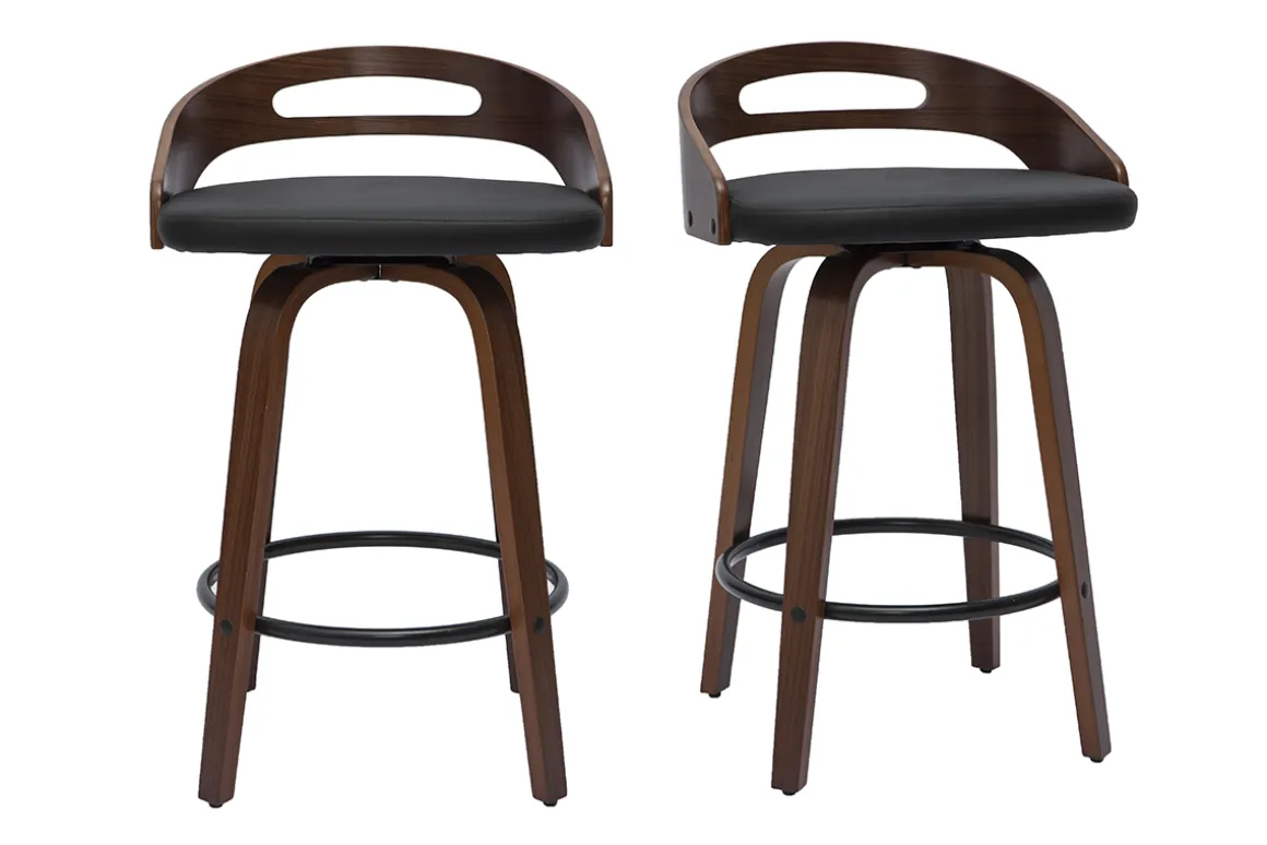 Tabourets de bar design bois foncé et polyuréthane noir 65cm MANO vendus par lot de 2 et livrés prêts à assembler.