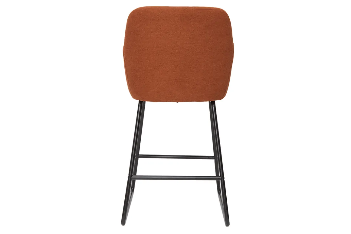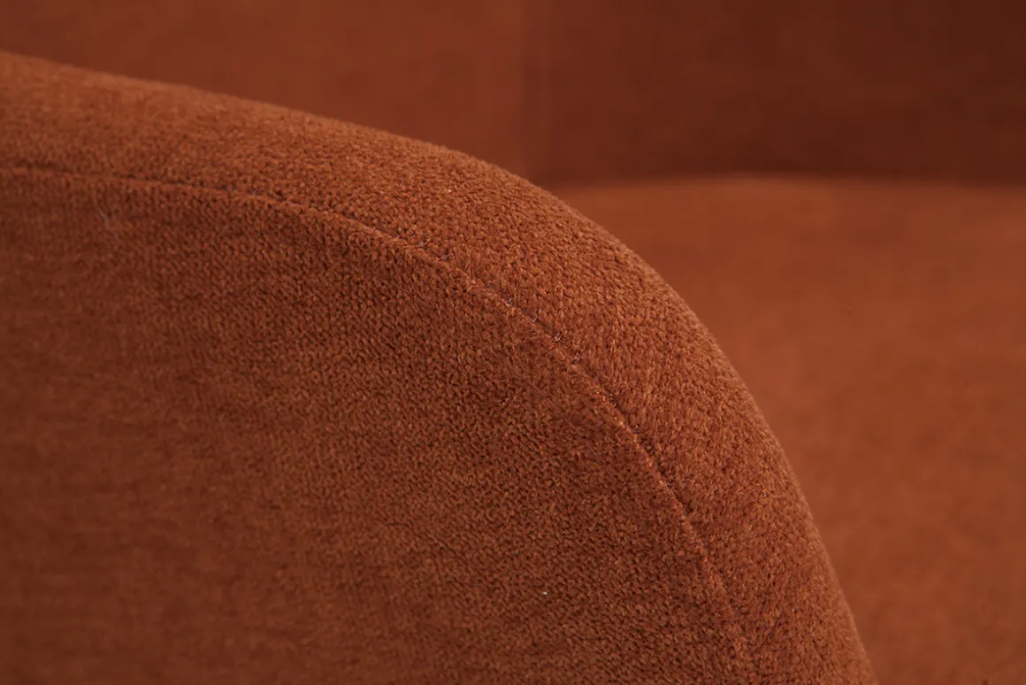 On aime particulièrement le contraste entre le piètement luge en métal noir très élancé et l’enveloppante assise rembourrée et moelleuse à souhait. L’assise et le dossier sont entièrement recouverts d’un joli tissu 100 % polyester terre brûlée à l’aspect et au toucher velours très doux.