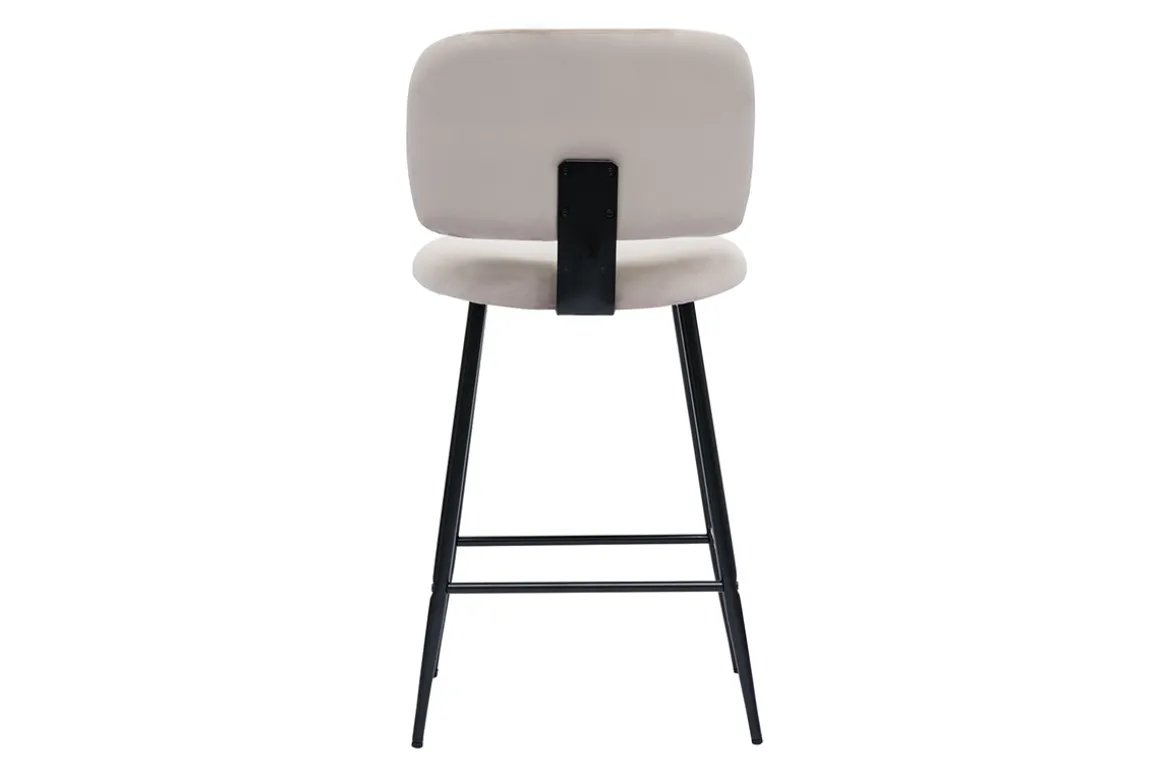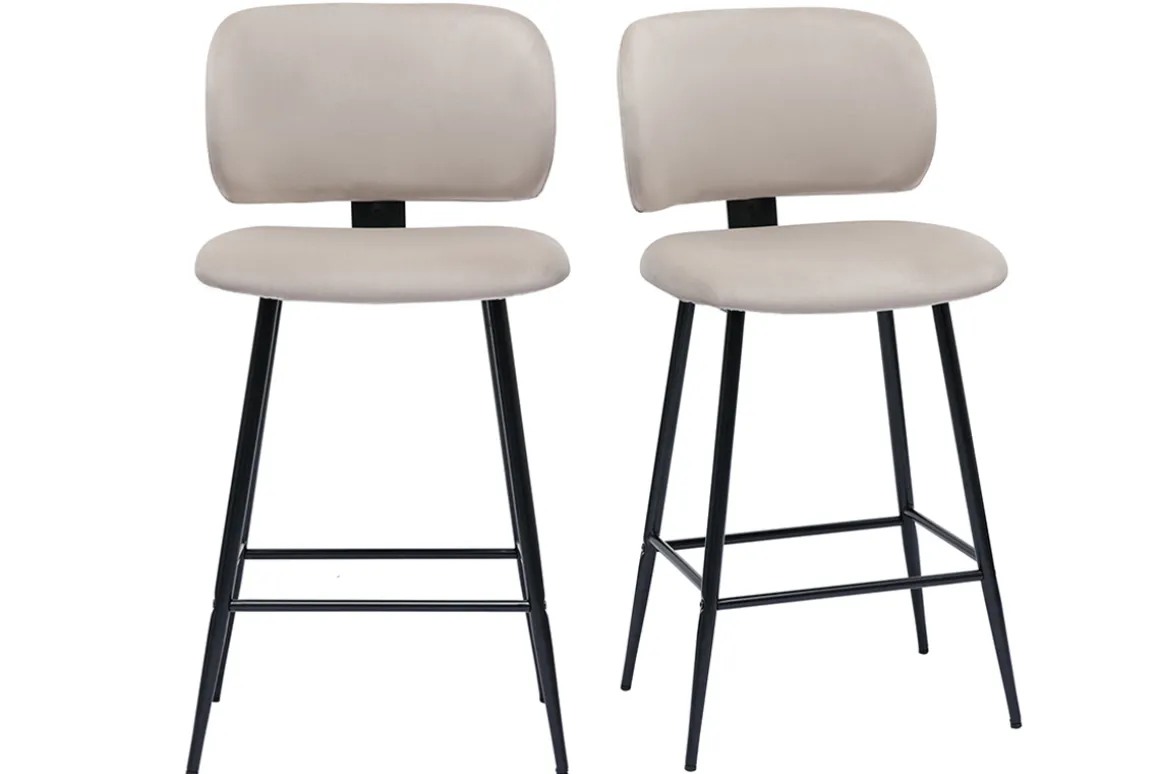 Tabourets de bar en tissu velours taupe et métal noir H70 cm vendus par lot de 2. Montage simple, seuls les pieds sont à fixer.