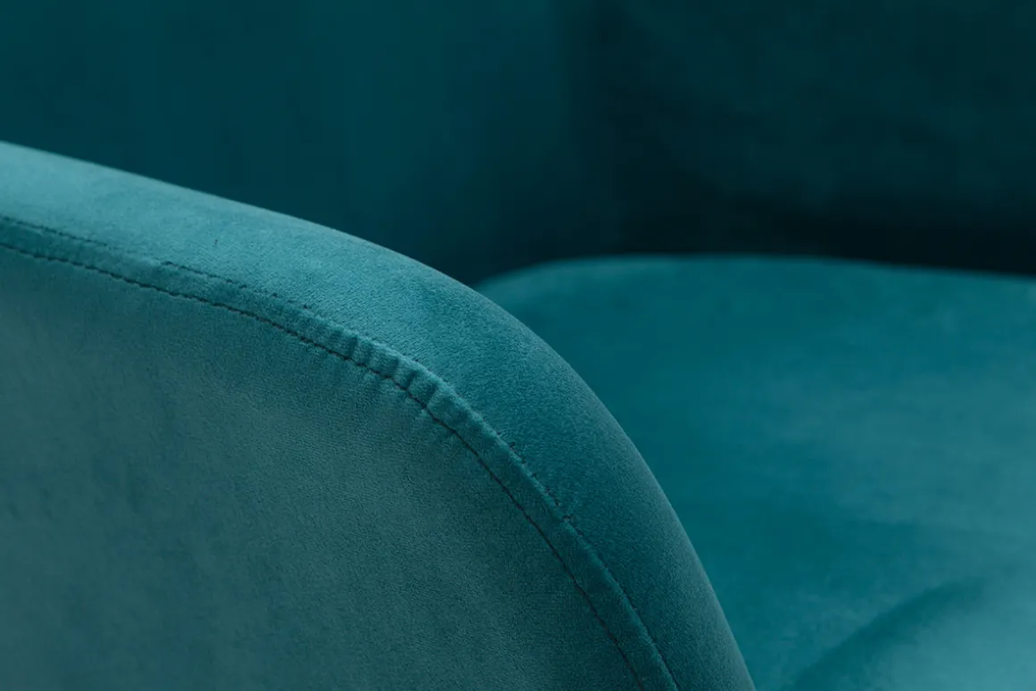 On aime particulièrement le contraste entre le piètement luge en métal noir très élancé et l’enveloppante assise rembourrée et moelleuse à souhait. L’assise et le dossier sont entièrement recouverts d’un joli velours 100 % polyester à l’aspect et au toucher doux. La teinte bleu pétrole ajoute à l’ensemble une touche tendance élégante.