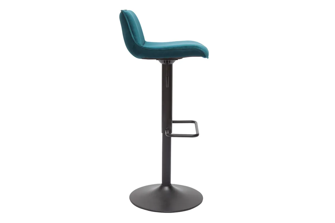 Tabourets de bar relevables en tissu velours bleu pétrole et métal noir vendus par lot de 2. Livrés prêts à monter.