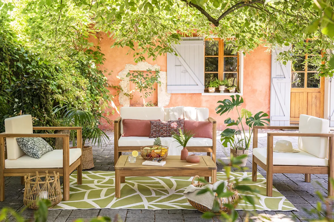 Aménagez-vous un salon de jardin ultra cosy en multipliant les textiles, les lampes d’extérieur et les accessoires colorés.