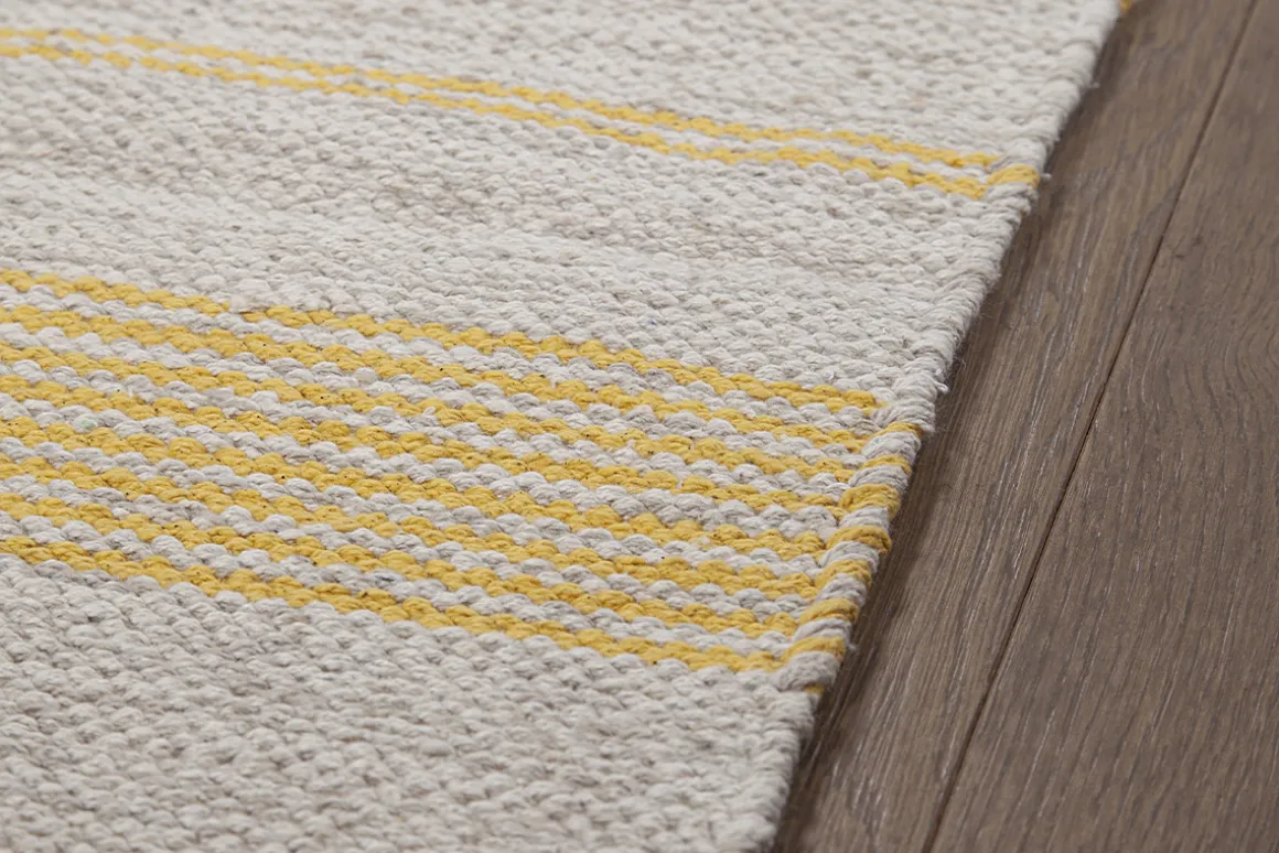 Vous souhaitez réhausser un sol suranné, relooker facilement une pièce ou tout simplement apporter une note cosy à votre chez vous ? Le tapis est LA touche finale des espaces en quête de douceur et de renouveau ! Avec ses dimensions L140 x L200 cm et ses rayures jaunes sur fond beige, on imagine ce grand tapis rectangulaire souligner du mobilier épuré en bois ou aux tons clairs, comme un canapé ou une table basse. Parfait pour égayer un salon, une chambre ou un bureau, ce tapis prendra place avec harmonie au coeur d’une déco méditerranéenne à l’inspiration ambiance bord de mer. Effet maison de vacances garanti toute l’année !