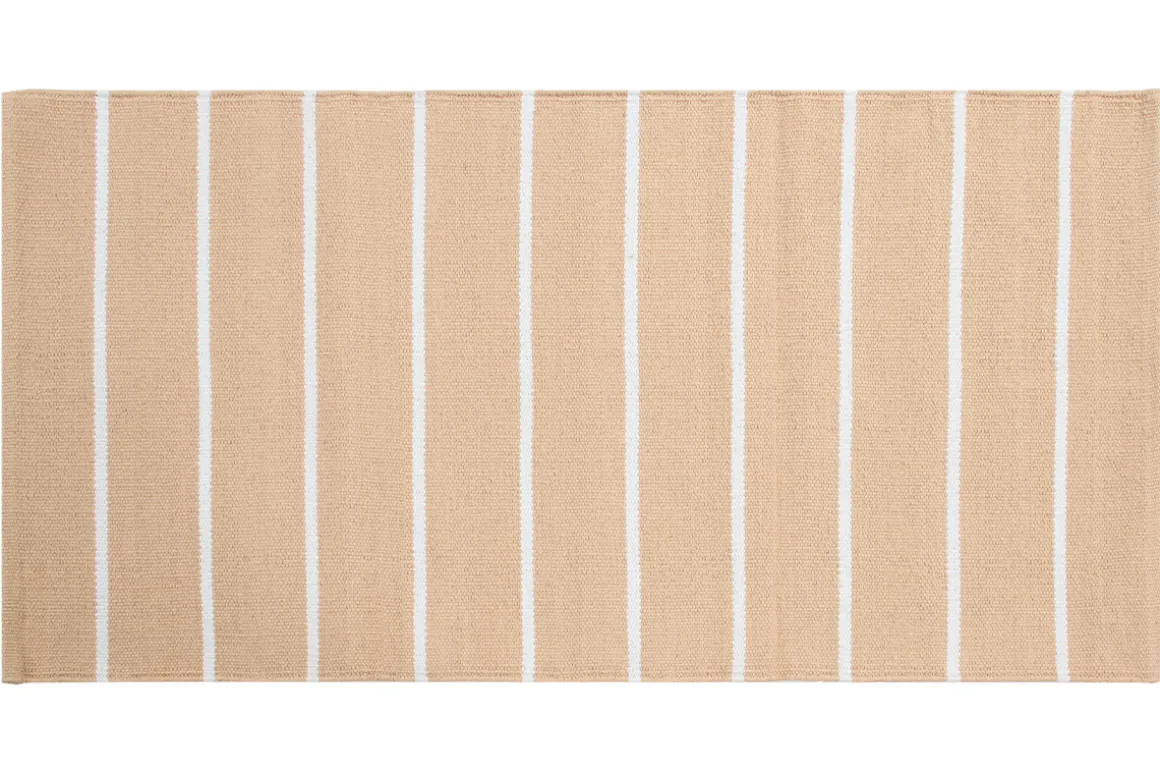 Clin d’oeil déco aux maisons du sud baignées de lumière, avec son motif bayadère, ce tapis beige à rayures blanches charme par son naturel et invite aux vacances… Toute l’année !