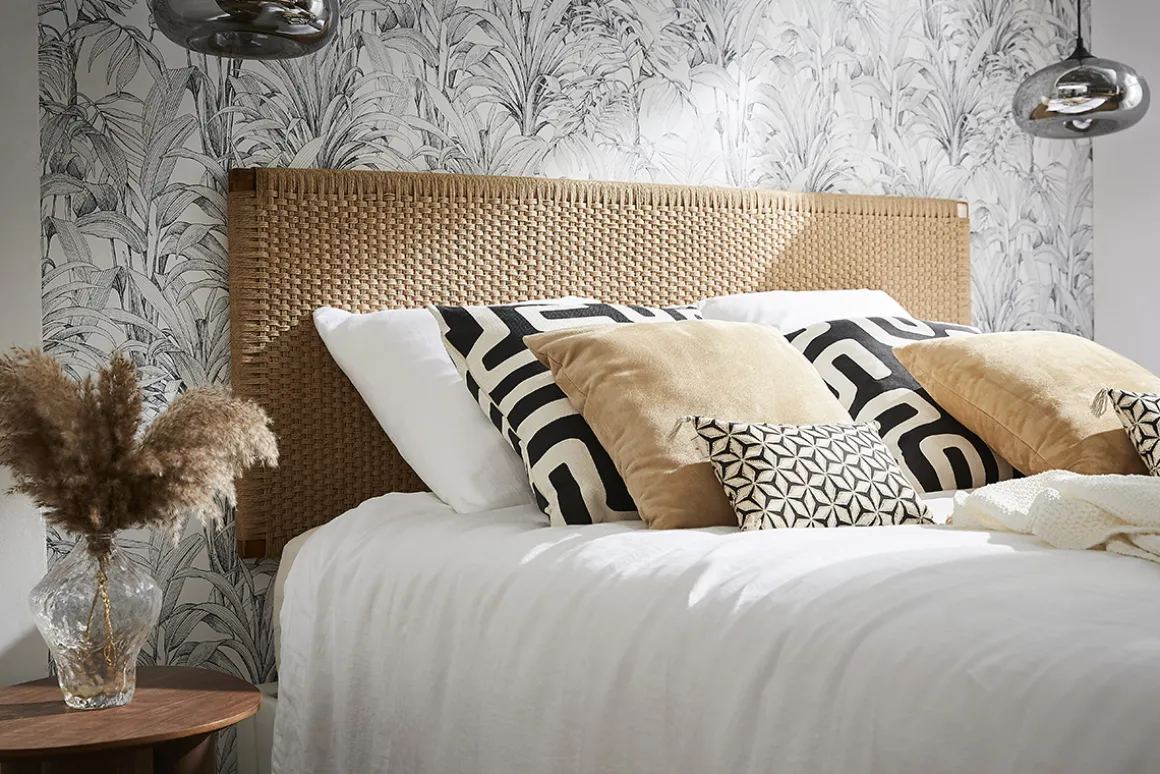 Pour une ambiance zen et créer un espace nuit empreint de douceur, associez cette tête de lit en corde à des tables de chevet en bois ou rotin.